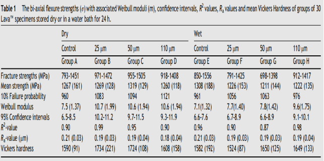從國外這位學者得出的的數據可知,在不同顆粒大小的氧化鋯噴砂下的斷裂強度,不論是干燥儲存還是是儲存相比對照組都是增大的,由此可知不論是從它的粘接強度還是陶瓷的機械強度來說都是有利的。綜上所述,考慮到氧化鋯的的表面粗糙度,機械強度,以及粘接強度,采用0.2MPa及 50μm或者110μm的噴砂條件對使氧化鋯與間接修復樹脂界面的粘結強度較佳,是較為推薦的噴砂條件。